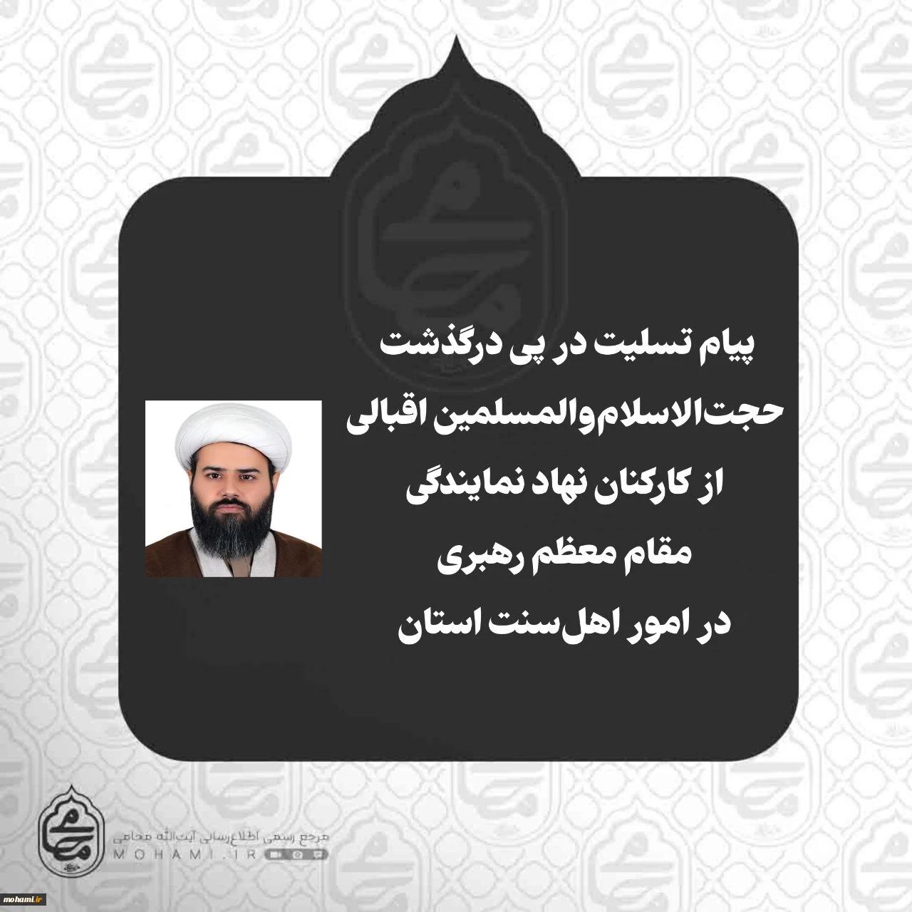 پیام تسلیت نماینده ولی‌فقیه در سیستان و بلوچستان در پی درگذشت حجت‌الاسلام‌والمسلمین اسماعیل اقبالی از کارکنان نهاد نمایندگی مقام معظم رهبری در امور اهل‌سنت سیستان و بلوچستان 2